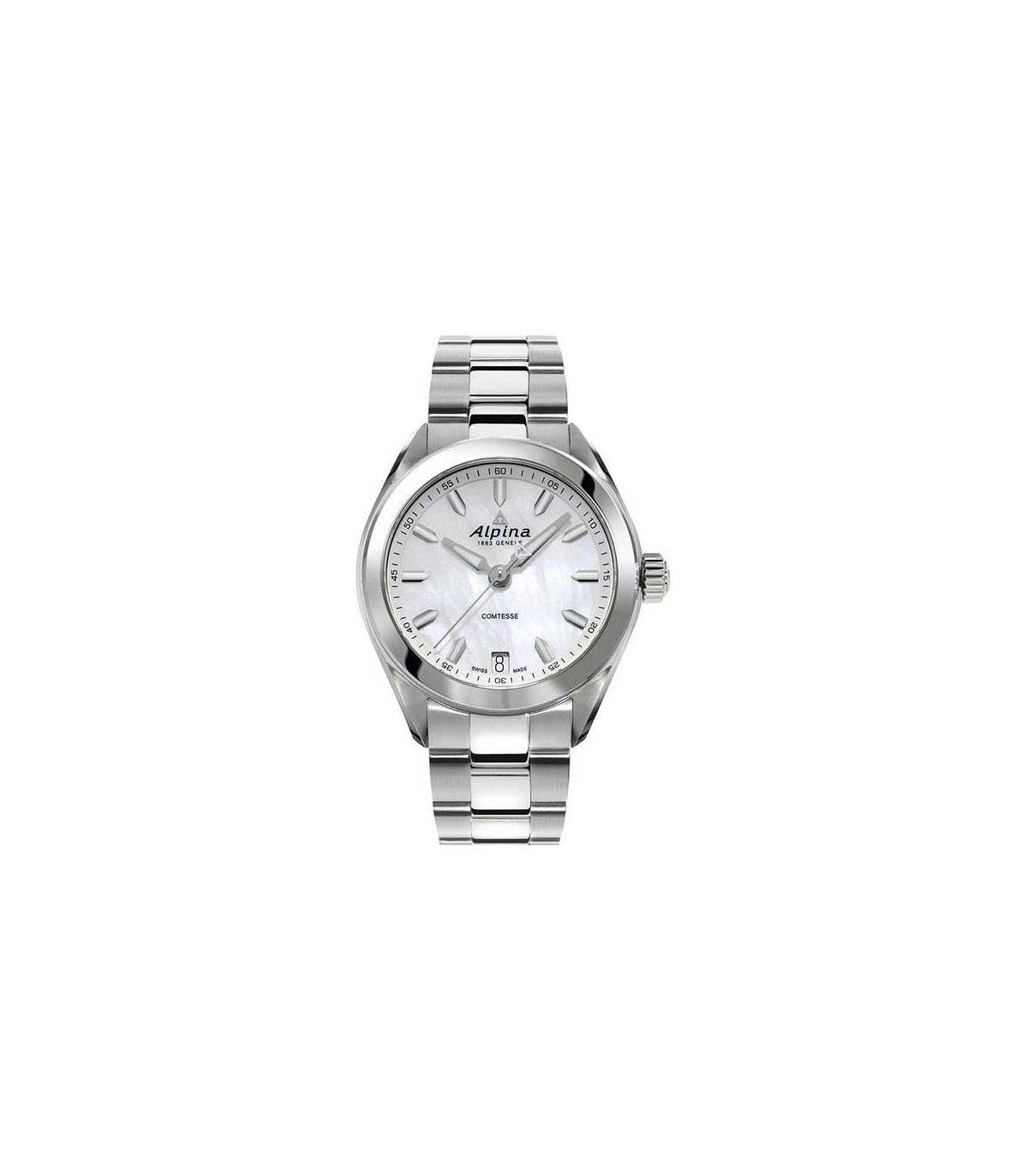 Alpina Comtesse white face with date window at 6 o'clock, sapphire crystal and stainless steel bracelet with deployment buckle. It is water resistant to 100 meters.
