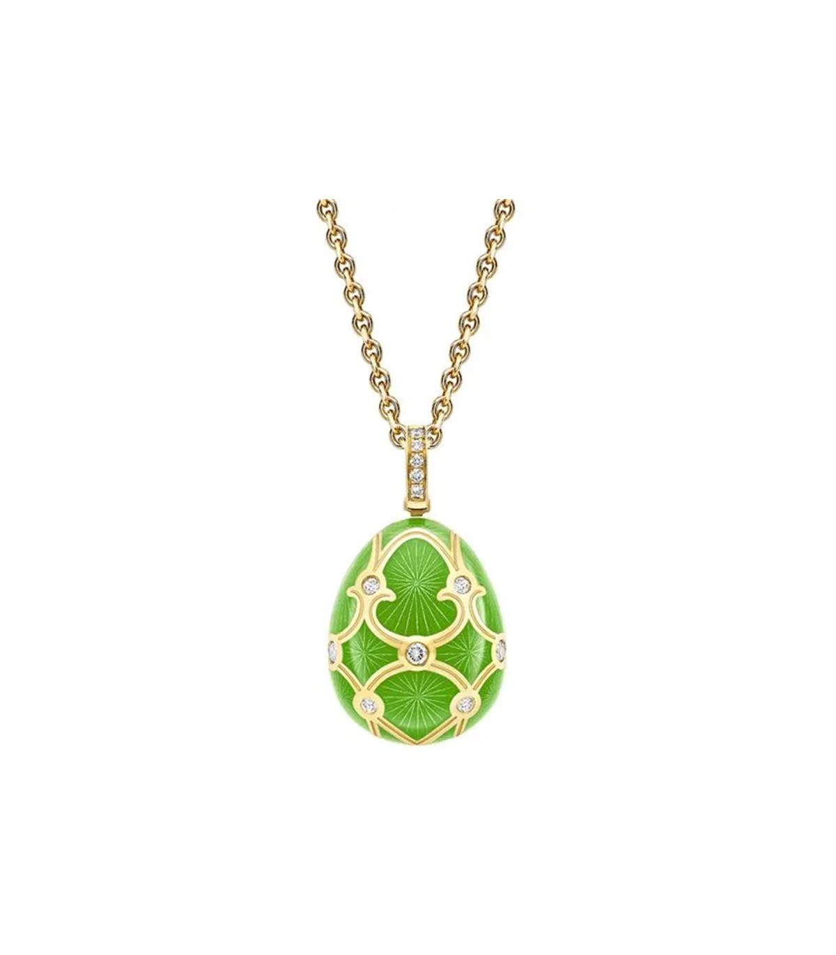This Fabergé Heritage pendant is crafted in 18ct yellow gold, showcasing bright green guilloché enamel and adorned with diamonds. The iconic petite egg design captures timeless elegance with a contemporary twist.