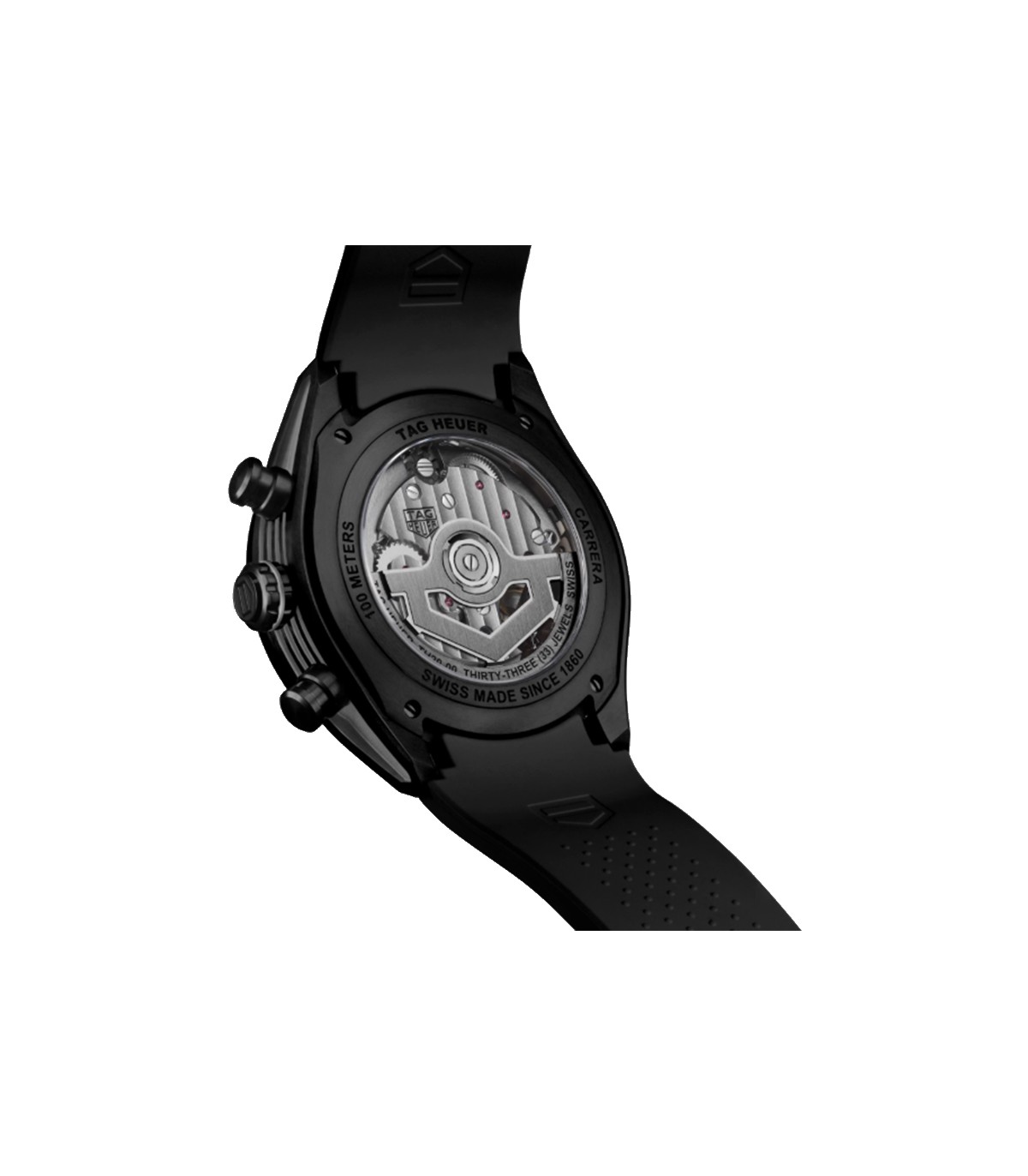 Tag Heuer Carrera Chronograph with a skeleton dial encased in titanium grade 2 with a black PVD, a black fixed ceramic bezel, sapphire crystal and case back. The strap is made of black rubber with a black PVD deployment buckle.
