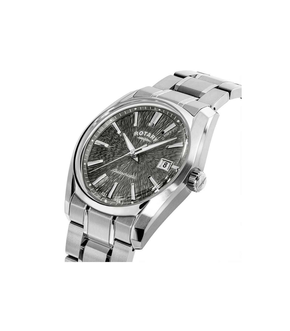 Rotary Lumen with a grey face, date window at 3 o´clock, domed mineral crystal, a stainless steel case and bracelet.