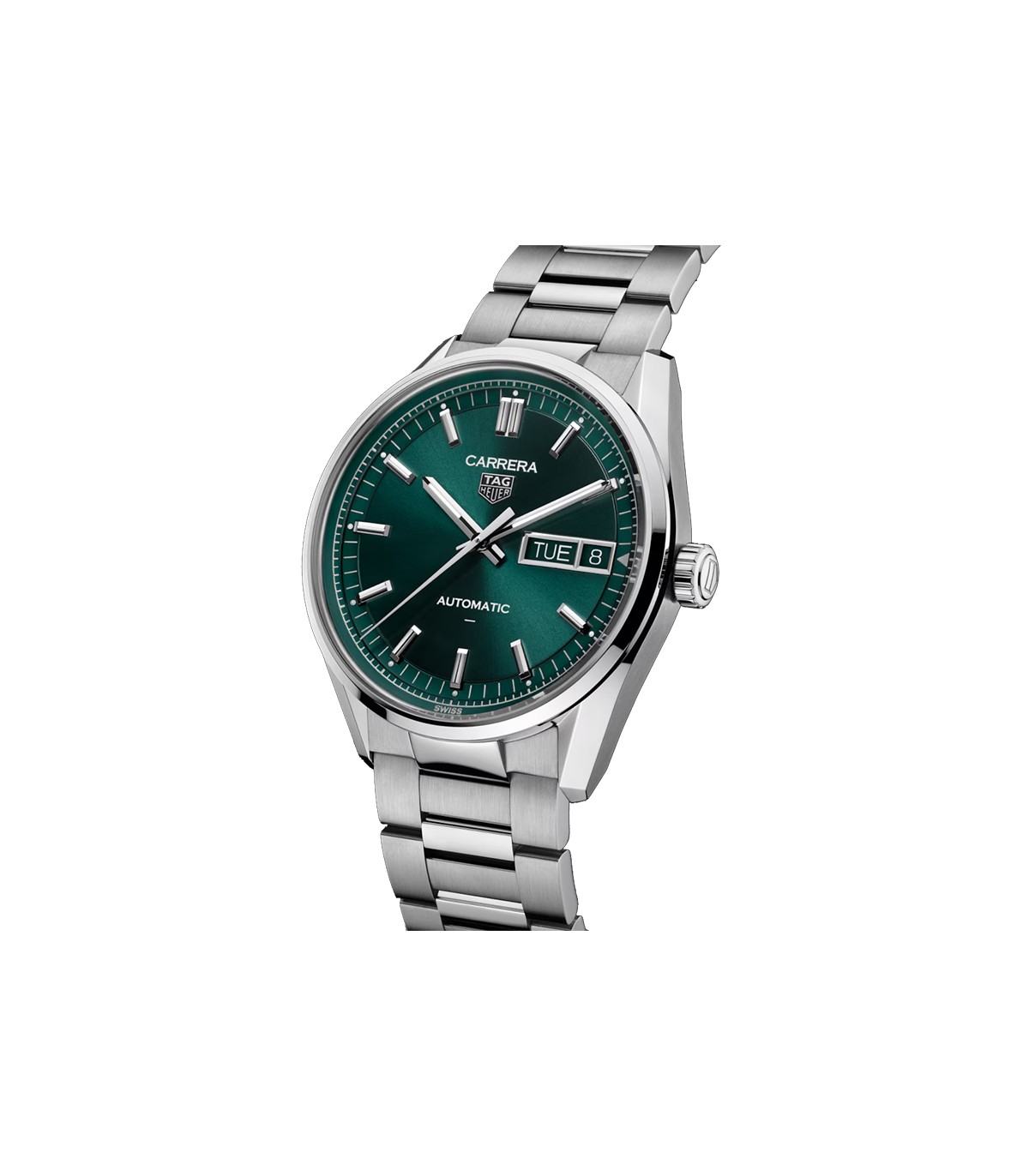 Tag Heuer Carrera Heuer 02 Automatic watch. Black dial, 42mm steel case, sapphire case back, classic three-row steel bracelet: a precision timekeeping instrument with an elegant, streamlined aesthetic.