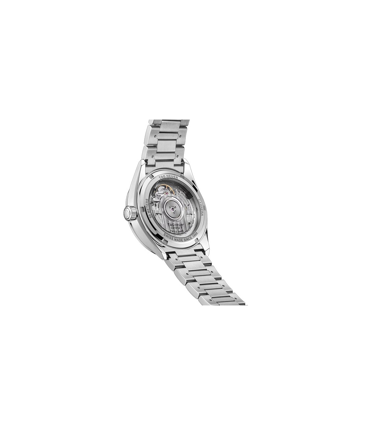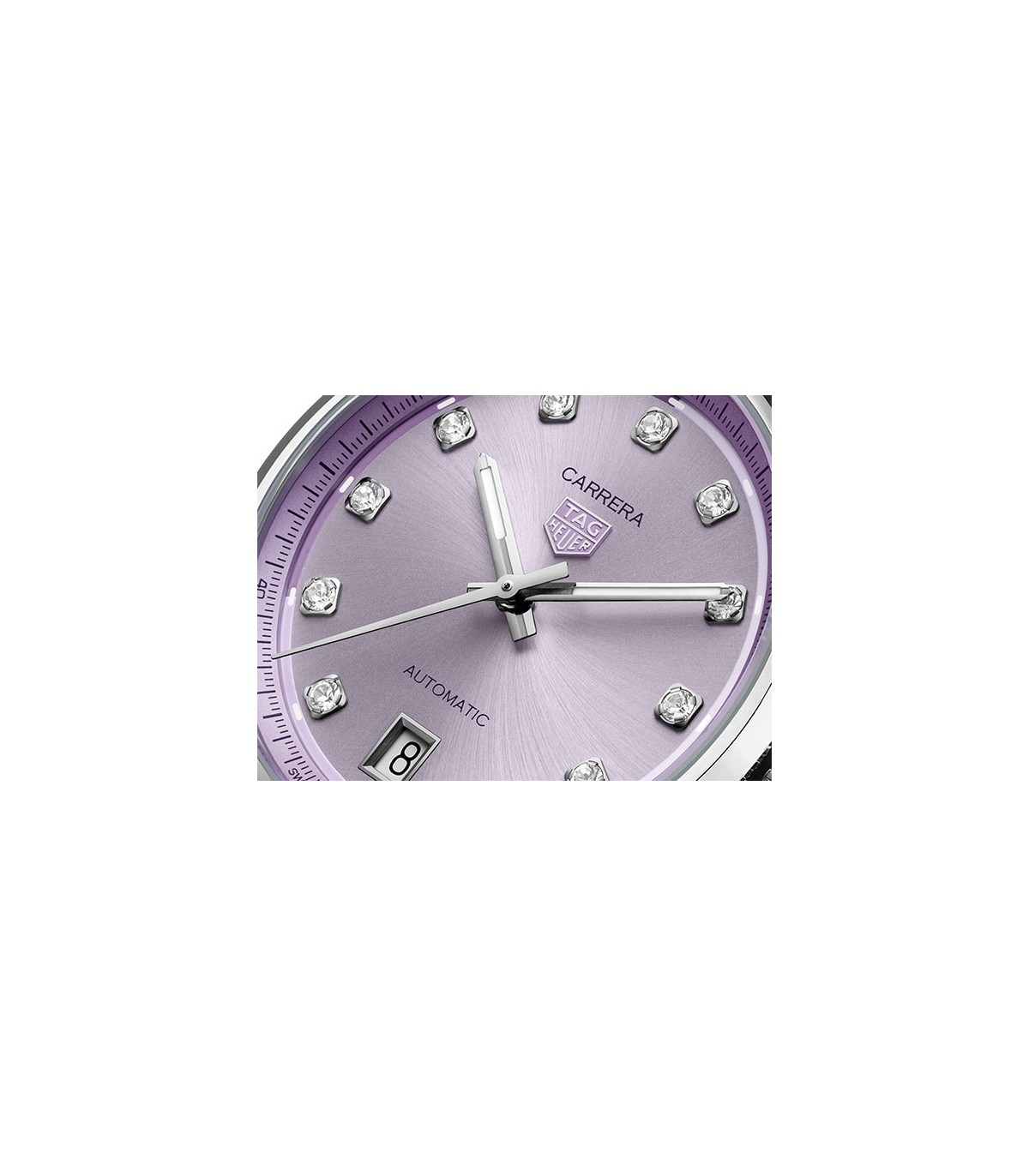 Tag Heuer Carrera with a lilac dial set with 11 diamonds with a total carat weight of 0.22, date window at 6 o'clock, sapphire crystal and a stainless steel bracelet with a deployment buckle.