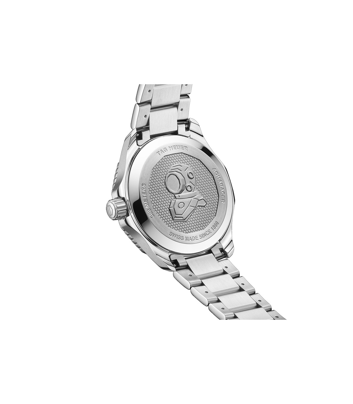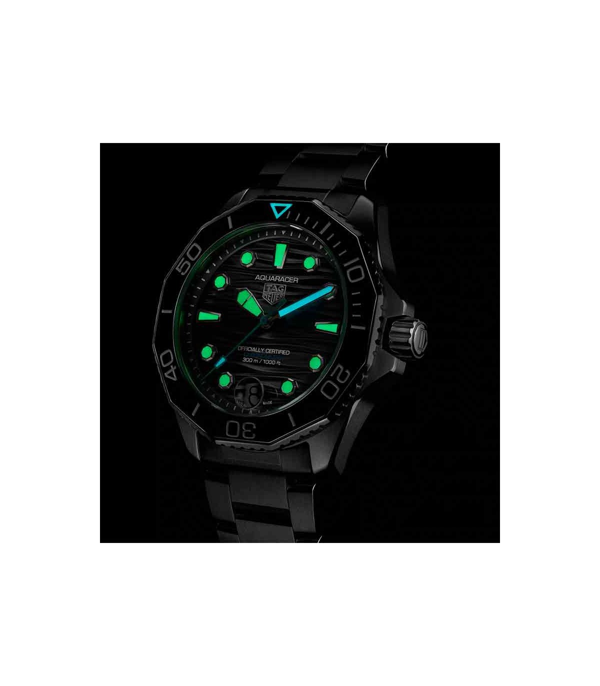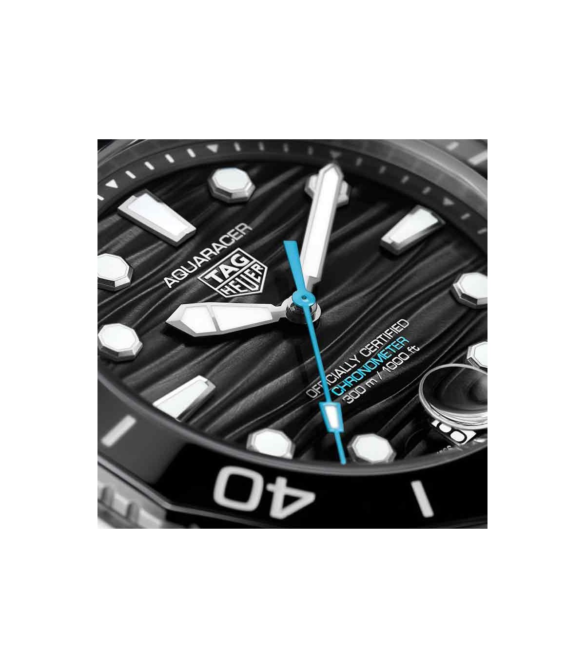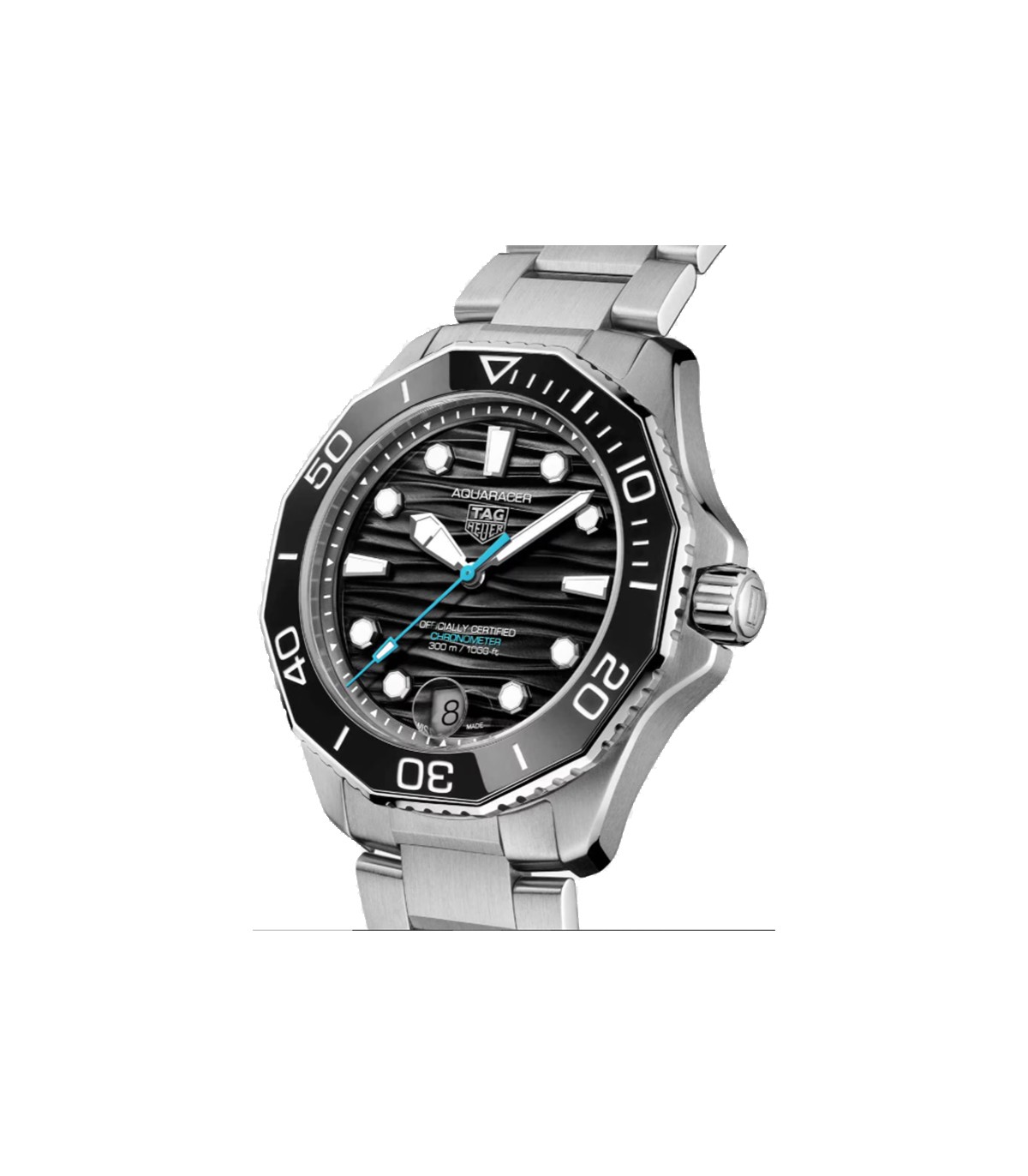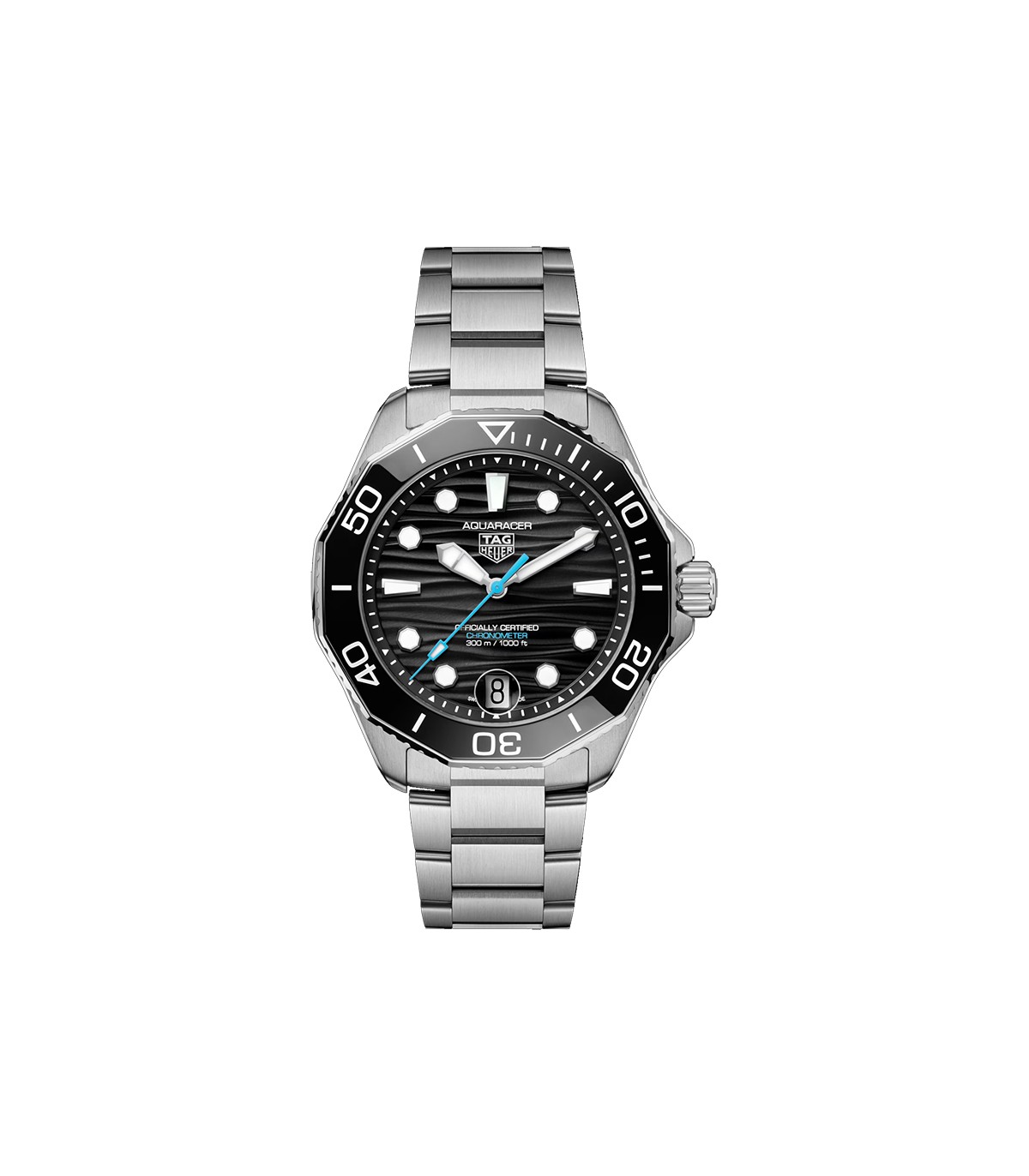 Tag Heuer Aquarecer black face with a black ceramic scale unidirectional bezel, date window at 6 o´clock, sapphire crystal and a stainless steel bracelet with a deployment buckle. This model is powered by an automatic movement with about 80h of power reserve.