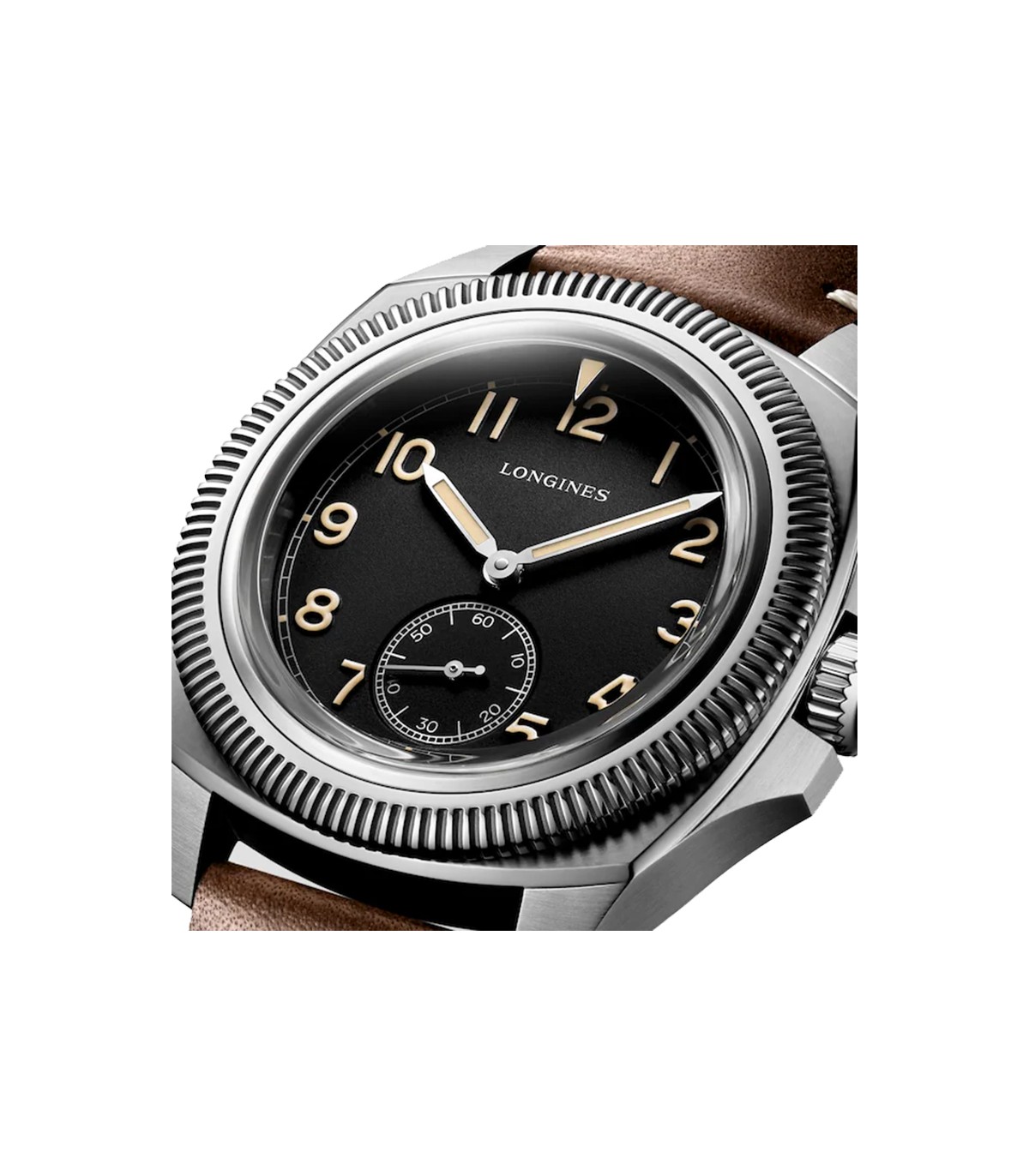 Longines Heritage Pilot Majetex with a black face, sapphire crystal, bidirectional rotating steel bezel, and brown leather strap with a buckle.