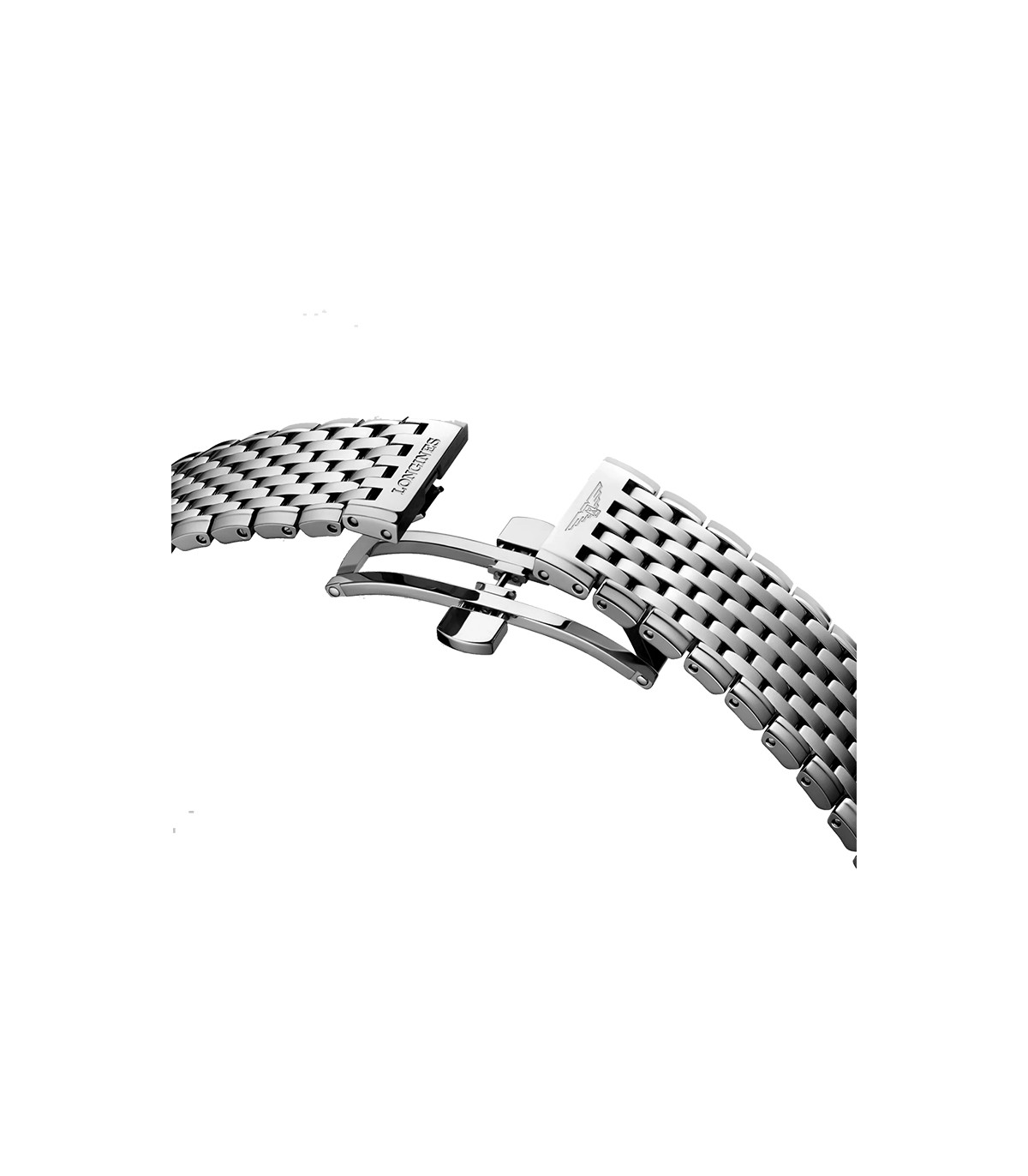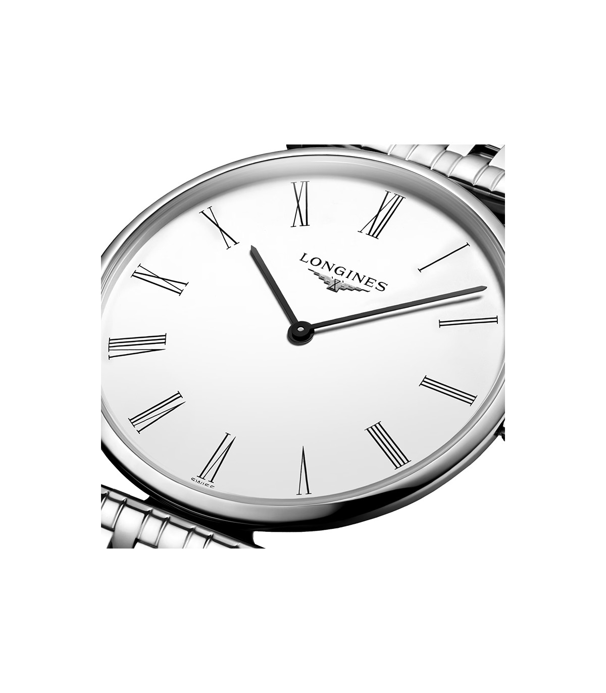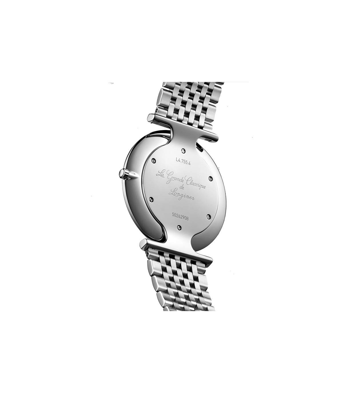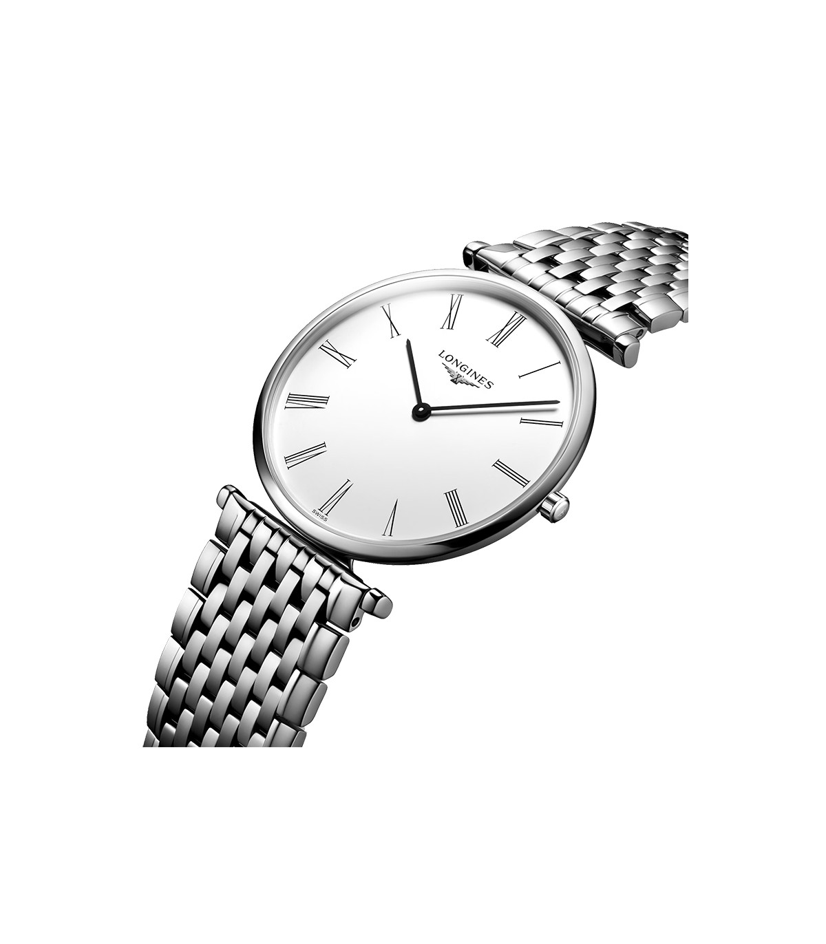 La Grande Classique de Longines with a white face, sapphire crystal and a stainless steel bracelet with a butterfly clasp. This model is powered by a Quartz watch L420 and is water-resistant to 30 meters.