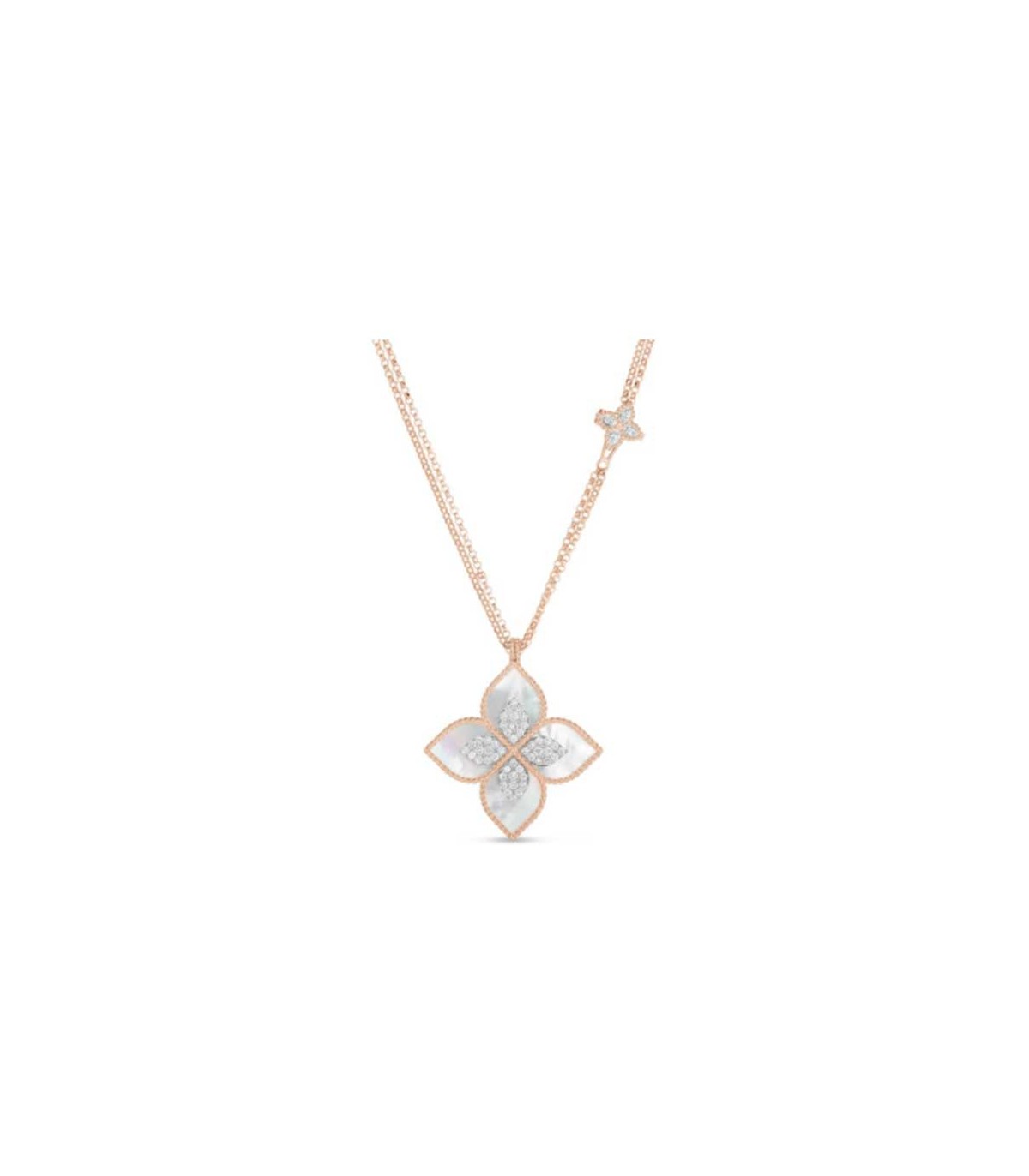 Roberto Coin Princess Flower necklace made of 18k rose gold with diamonds and white mother of pearl