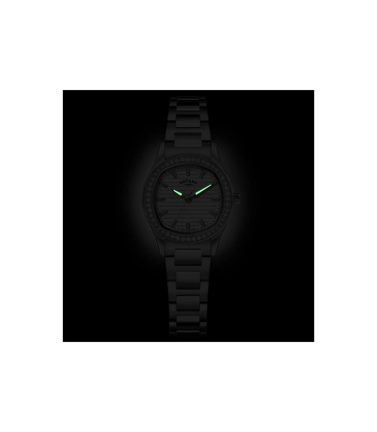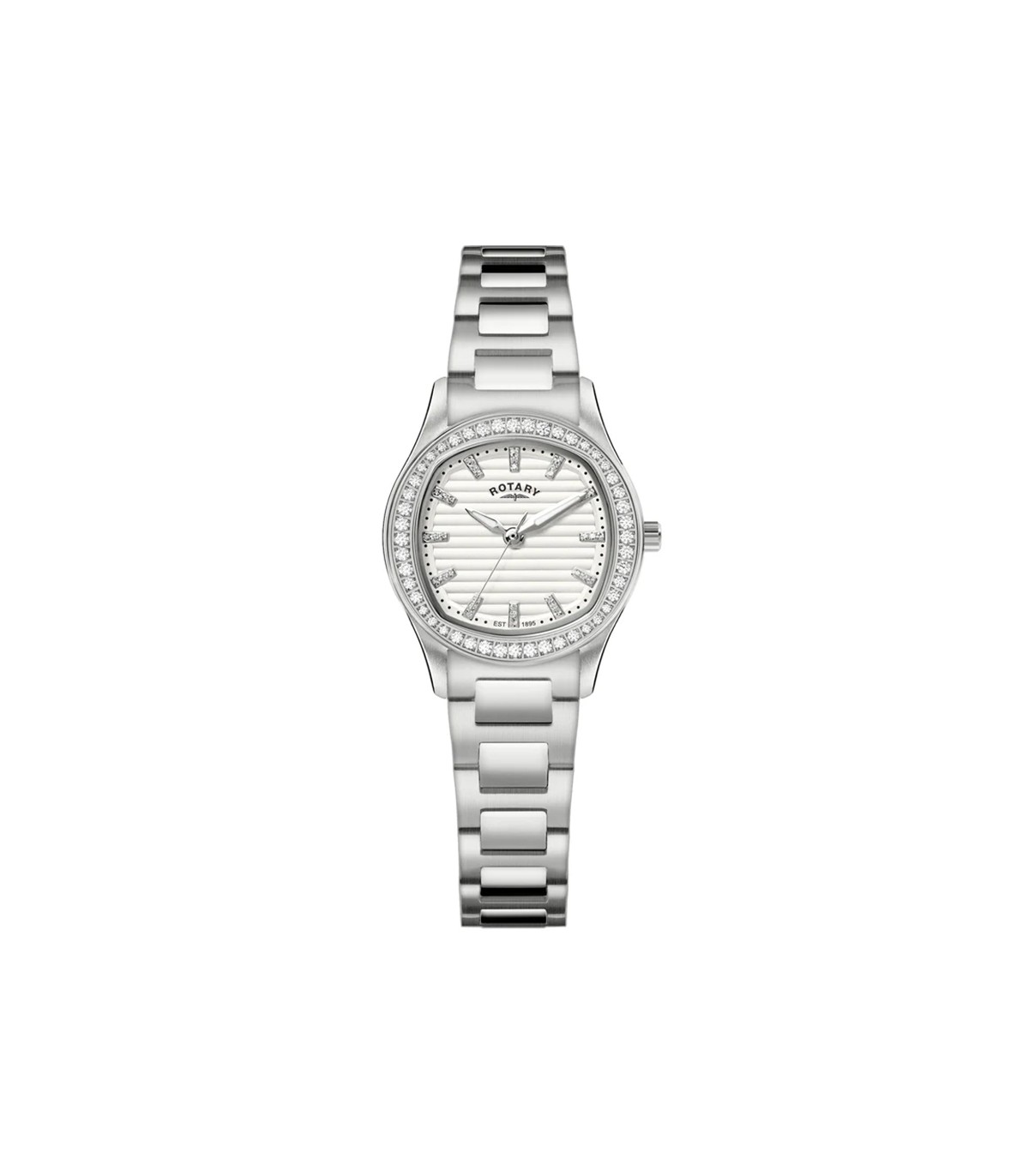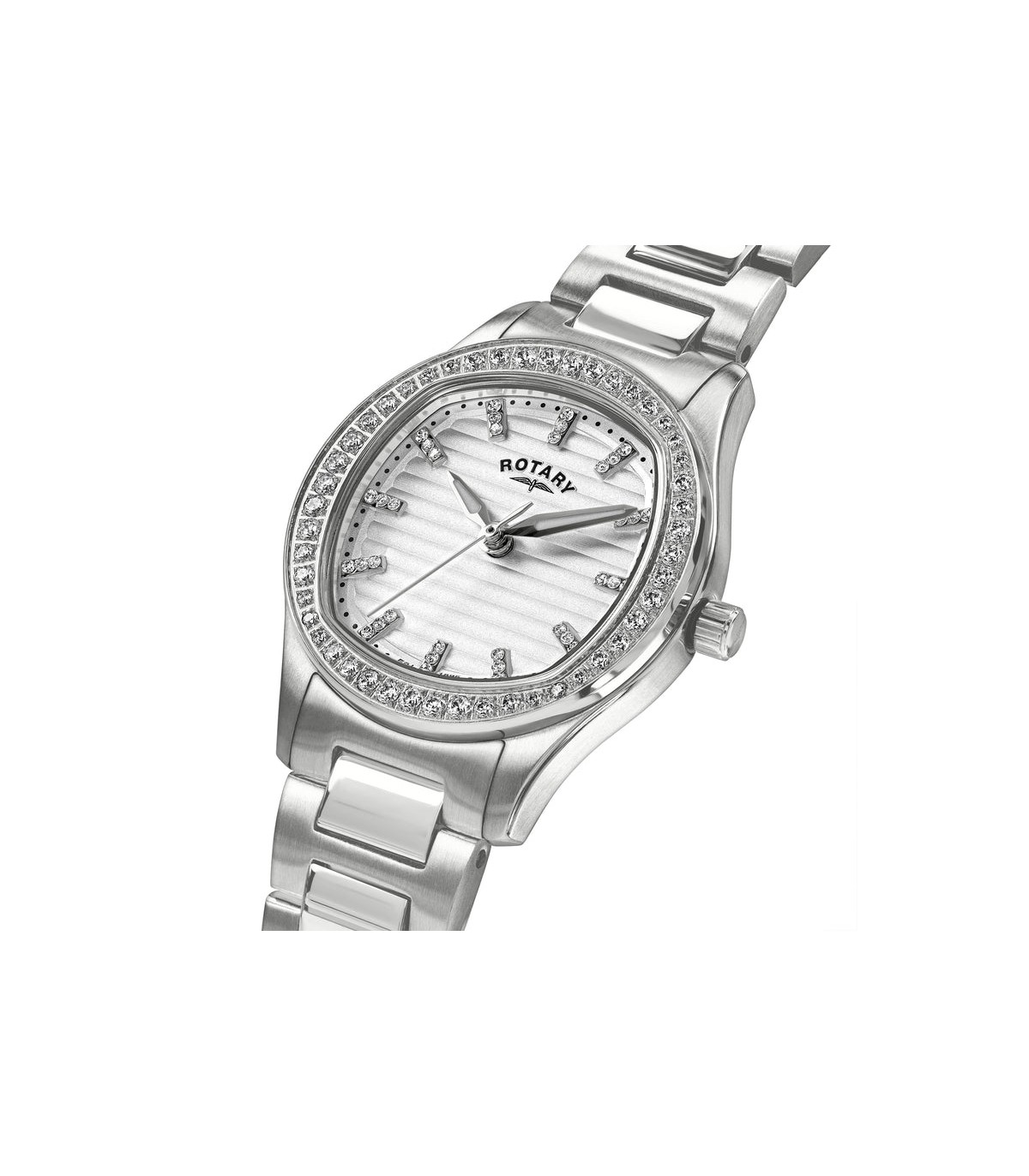 Rotary Brilliance with a white face, sapphire crystal, cz shimmering baton hour markers and a 28mm stainless steel case with sparkling crystals that catch the light with every movement.