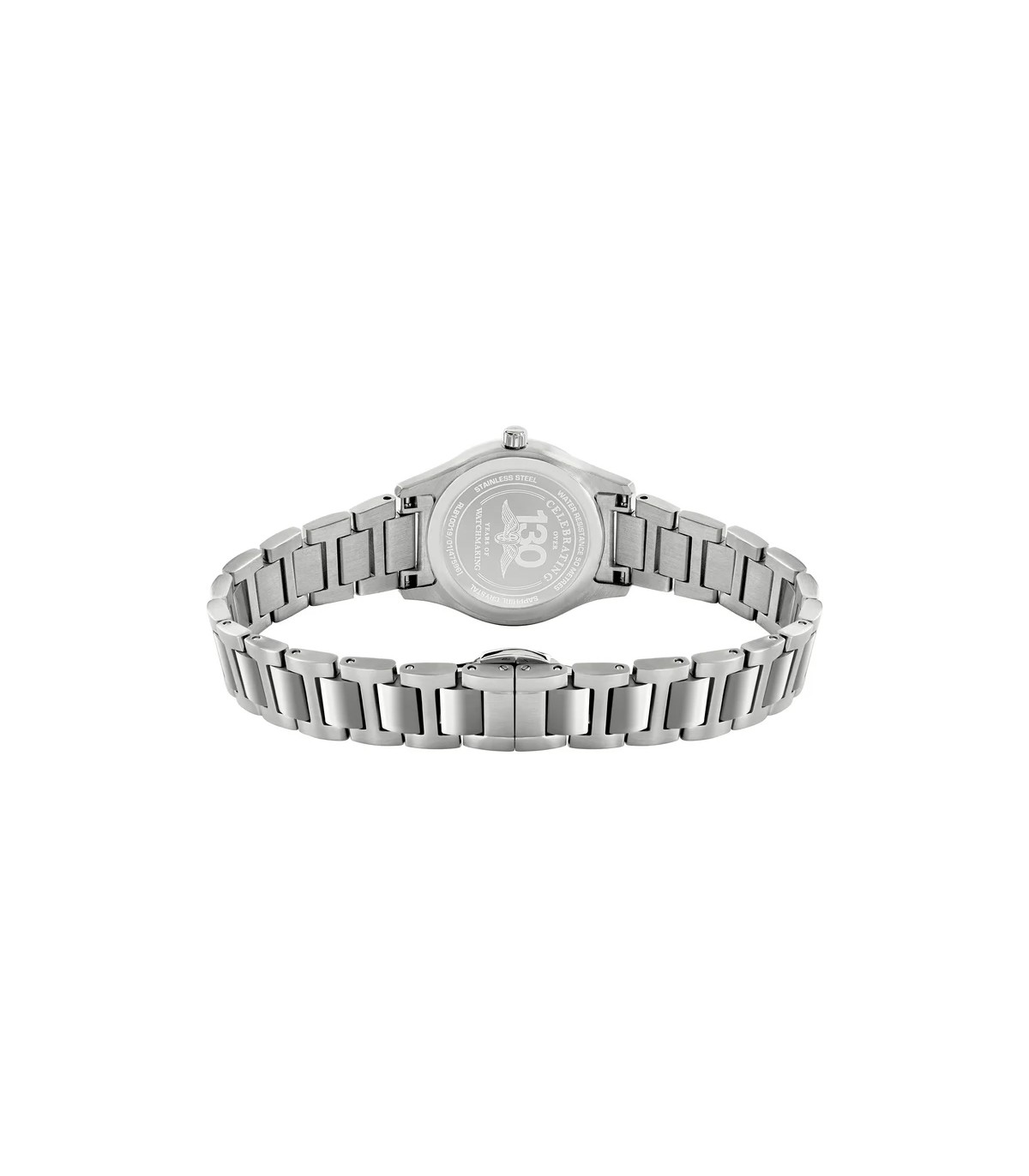 This model is powered by a quartz movement and is water-resistant to 50 meters.