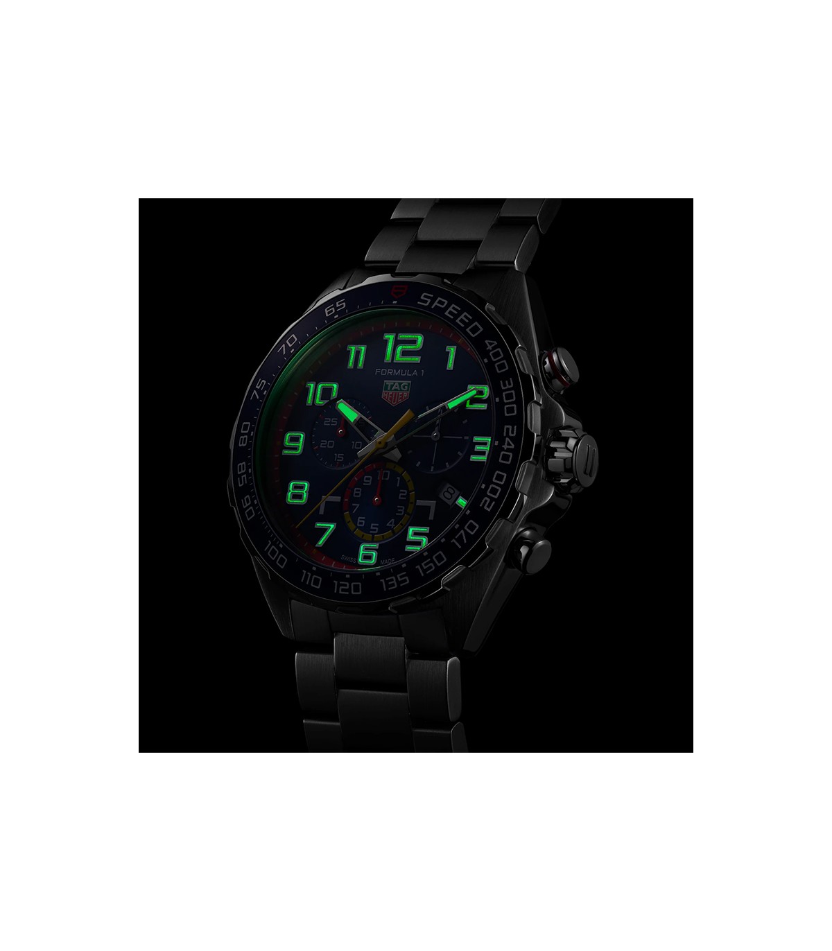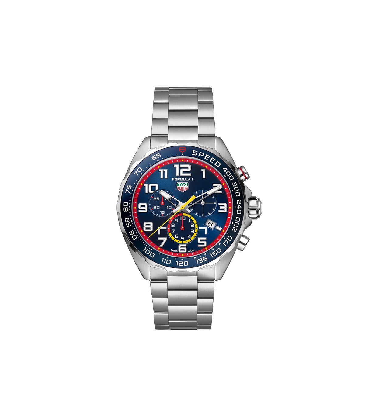 Tag Heuer Formula 1 chronograph with an energetic blue face with highlights in red and yellow, sapphire crystal, and stainless steel bracelet with deployment buckle. The bezel is fixed and is made of aluminum.